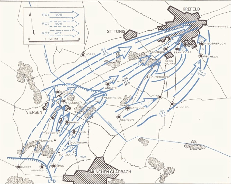The objective of the 102d Infantry Division when it resumed its attack on 25 February was a four-mile stretch of the Rhine including Uerdingen and the Adolf Hitler Bridge, one of the most important German escape routes across the Rhine. A more immediate objective, however, was Erkelenz, a large communications center and potentially a key defensive obstacle to the Divisions advance. Following the capture of Erkelenz, the Divisions mission was to cover the XIX Corps operation against Munchen-Gladbach, then advance and capture the important town of Viersen. Finally, the Niers Canal would have to be crossed and the large- city of Krefeld secured.