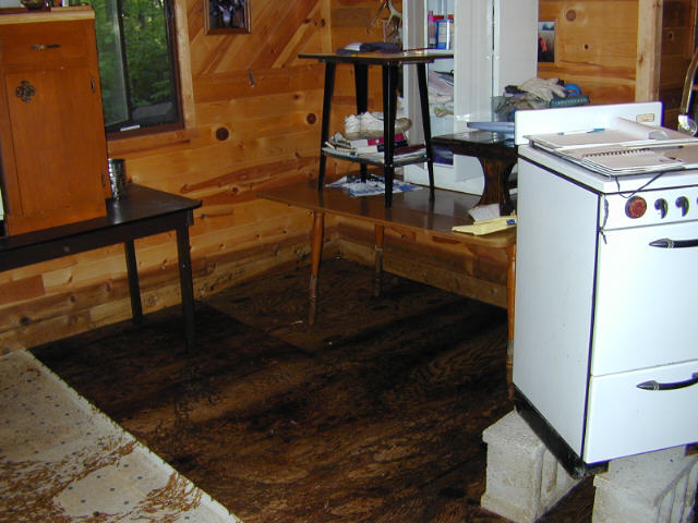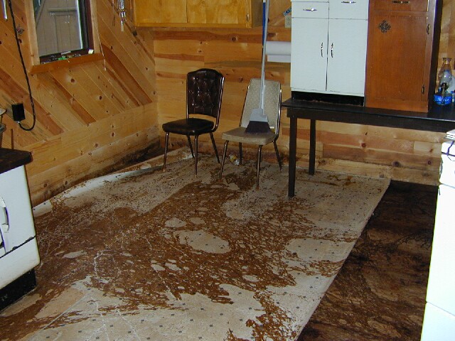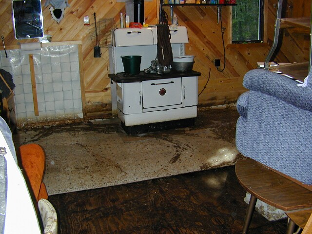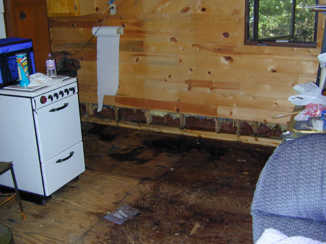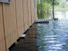 After the water started going down we got back in the cabin and started the cleanup. All the work done getting stuff up off of the floor before the water got in the cabin really paid off. I removed the bottom 2 rows of tongue and groove and removed the wet insulation. A few weeks later after it had dried out, I replaced the insulation and capped it with a 2X10. I also replaced the vinyl, put everything back in place and it was as good as new.